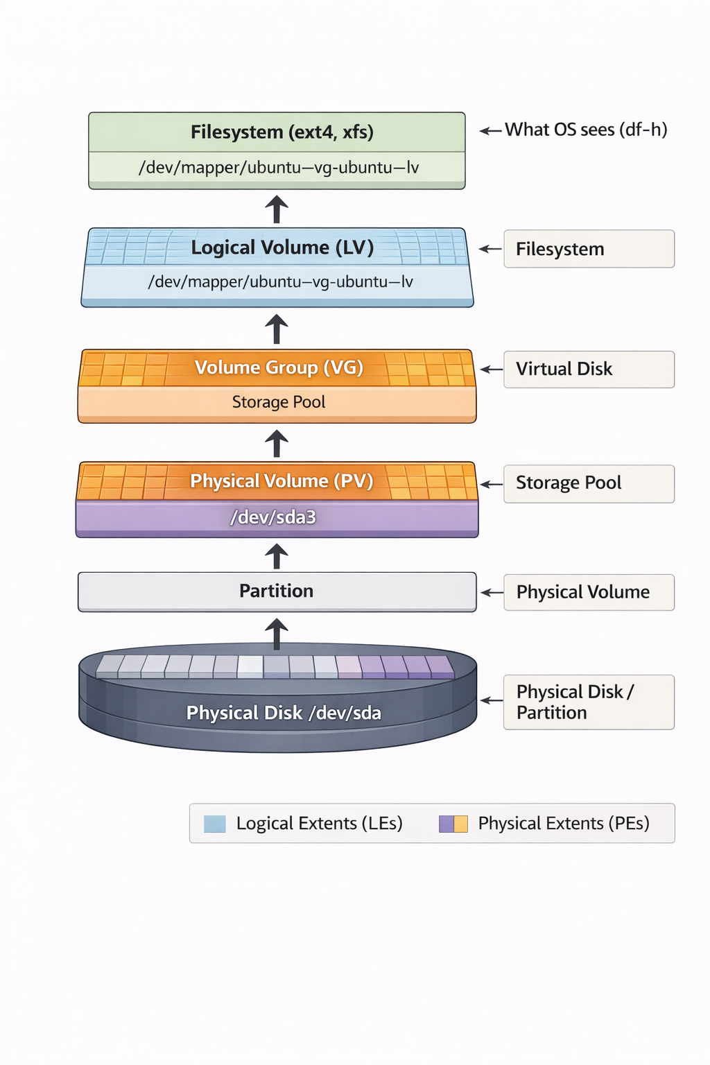 - Logical Volume (LV) — логический том (виртуальный диск)